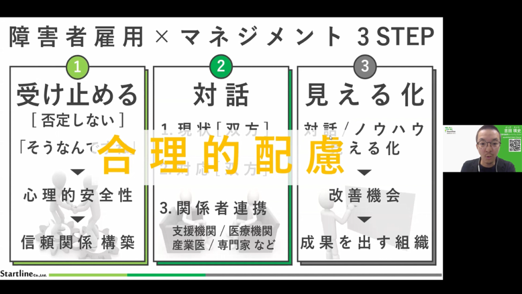 障害者雇用の必要性、基礎知識を理解した上で、現場で重要なノウハウを「マネジメント3STEP」と「成果が出る組織理論×合理的配慮」に関連性づけて解説しました。