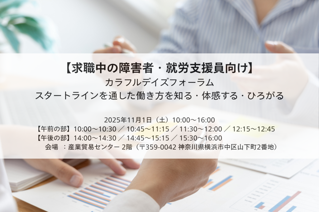 障害者就業支援を通じて“誰もが自分らしく生きる社会”を目指す株式会社スタートライン (本社:東京都三鷹市、代表取締役:西村賢治)は、2025年11月1日(土)に産業貿易センターにて、障害者・支援員向けにカラフルデイズフォーラム スタートラインを通した働き方を知る・体感する・ひろがるを開催することをお知らせします。