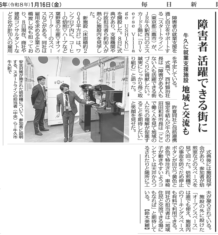 毎日新聞に、1月5日に開設したDiverse Village USHIKUに関する記事が掲載されました。