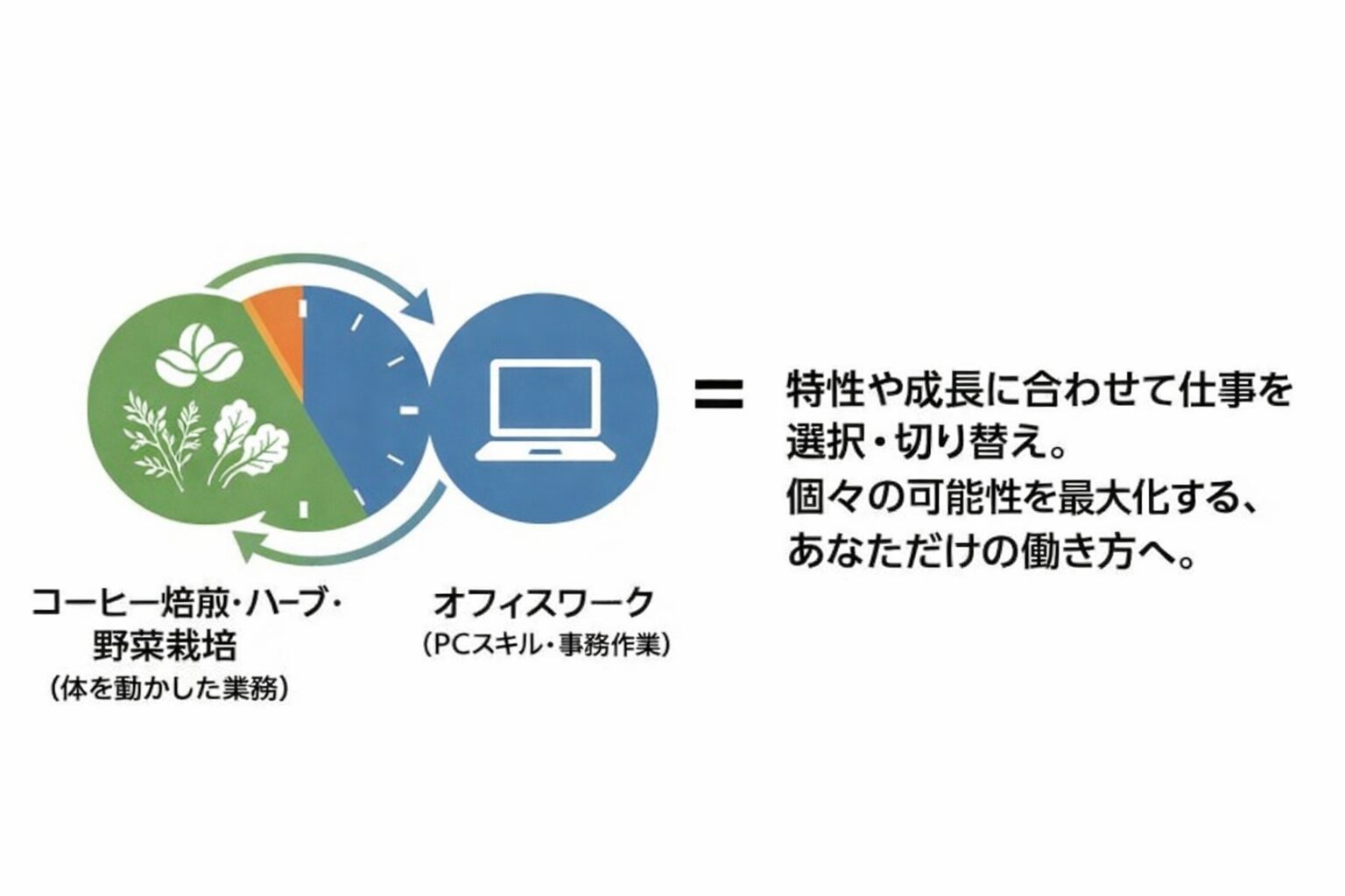 Diverse Villageでは、コーヒー焙煎・ハーブや葉野菜などの栽培・オフィスワークなど複数の業務を同じ場所で経験でき、特性や成長に合わせて、業務を選択・変更できる環境を整備した複合型の拠点です。