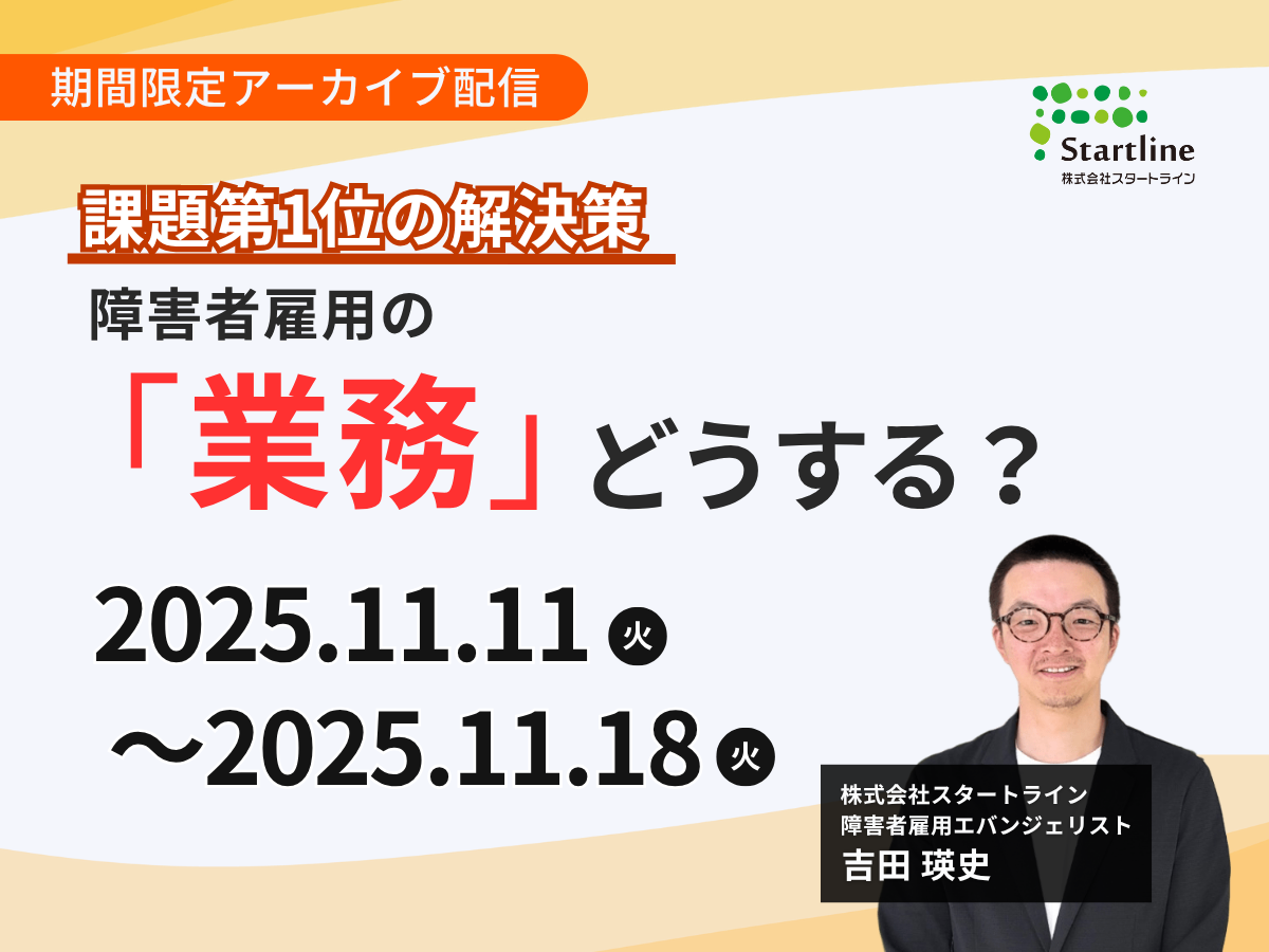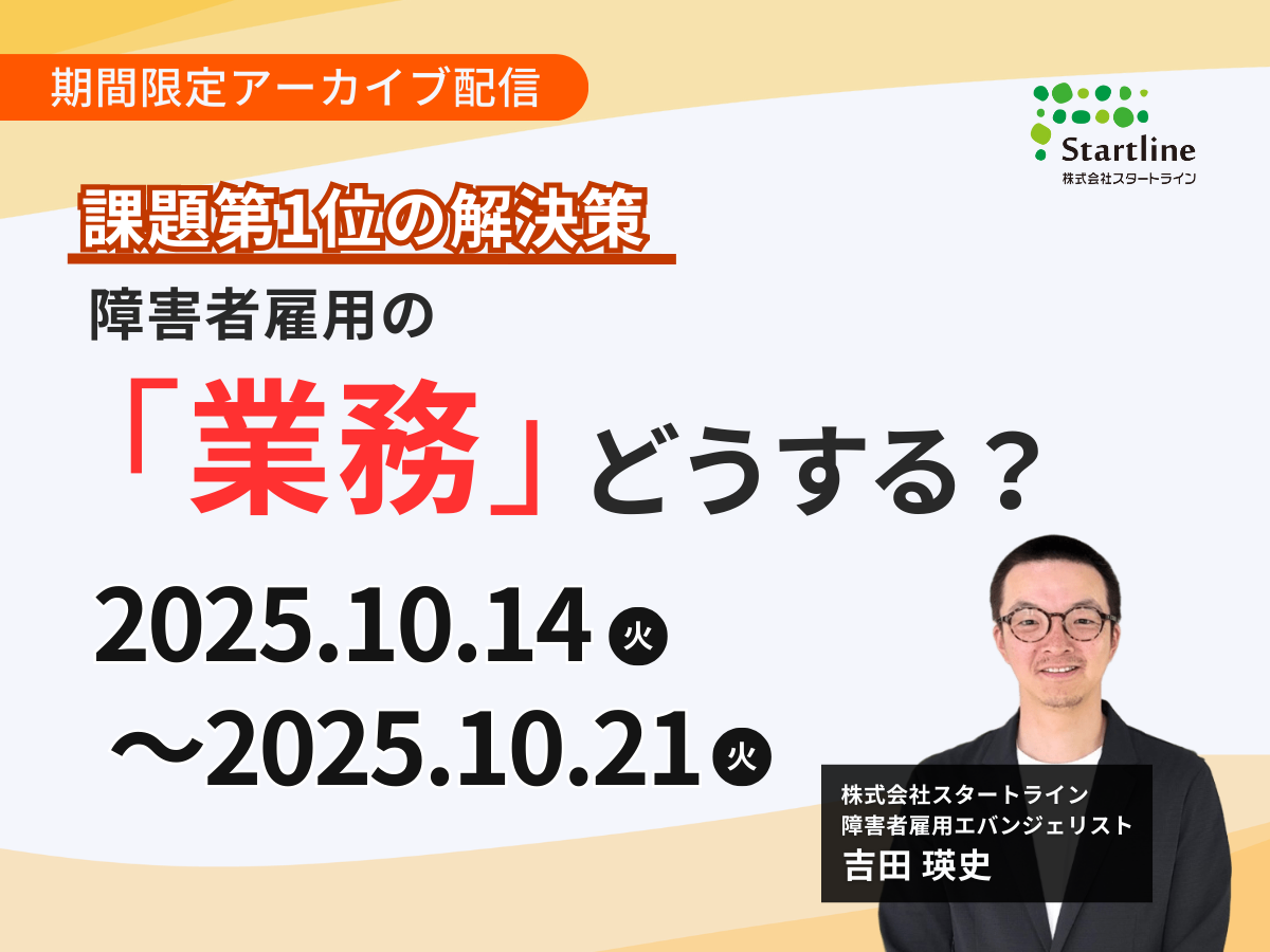 セミナー情報 カテゴリーから探すカテゴリーすべてカテゴリーライブ配信カテゴリーオンデマンドカテゴリーリアル開催カテゴリー障害者・支援機関向け オンデマンド オンデマンド2025/11/11 10:00〜2025/11/18 18:00 【11/11~11/18 限定配信】 『課題第1位の解決策』 障害者雇用の「業務… オンデマンド2025/10/14 10:00〜2025/10/21 18:00 【10/14~10/21 限定配信】 『課題第1位の解決策』 障害者雇用の「業務… オンデマンド2025/09/16 10:00〜2025/09/24 18:00 ※開催終了※『課題第1位の解決策』 障害者雇用の「業務」どうする? 全部見る ライブ配信 これからのセミナー ライブ配信 2025/10/30 12:00〜13:00 【10/30(木)12:00~】『2025年最新版・事前質問あり』発達障害やグレ… ライブ配信 2025/11/04 11:00〜11:40 【11/4(火)11:00~】 障害者雇用の[最新状況]と[失敗例]と[解決法]… リアル開催 2025/11/06 16:00〜17:00 【11/6(木)16時~】『三菱地所プロパティマネジメント株式会社ご登壇!』サテ… ライブ配信 2025/11/25 11:00〜11:40 【11/25(火)11:00~】『課題第3位の解決策』 障害者雇用の採用どうする… これまでのセミナー ライブ配信 2025/10/15 11:00〜11:40 ※開催終了※Diverse Village 誕生!~流動性・柔軟性のある障害者雇… ライブ配信 2025/10/09 11:00〜12:00 ※開催終了※モヤモヤ解消!“うまくいかない”障害者雇用やLGBTQ+採用の壁を超… ライブ配信 2025/10/07 11:00〜11:40 ※開催終了※『全国2000社の声』から見えた!障害者雇用のリアルと解決策 ライブ配信 2025/09/30 11:00〜11:40 ※開催終了※『5000名以上の経験ノウハウ』定着する精神/発達障害者の面接確認ポ… ライブ配信 2025/09/04 12:00〜13:00 ※開催終了※障害者雇用×電話応対品質向上~人事課題とCX向上を同時に解決する新た… ライブ配信 2025/09/02 11:00〜11:40 ※開催終了※『全国2000社の声』から見えた!障害者雇用のリアルと解決策 全部見る リアル開催 これからのセミナー リアル開催 2025/11/06 16:00〜17:00 【11/6(木)16時~】『三菱地所プロパティマネジメント株式会社ご登壇!』サテ… これまでのセミナー リアル開催 2025/07/09 00:00〜00:00 ※開催中止※他社とつながる!対面&少人数で障害者雇用の情報交換の場【対面セミナー… リアル開催 2025/06/17 15:00〜17:00 ※開催終了※他社とつながる!『今こそ対面&少人数!』障害者雇用の課題解決と情報交… リアル開催 2023/06/07 17:00〜18:15 ※満席となりました※【6/7(水)17:00~】【講義+ワークショップ】ケースで… 全部見る 障害者・支援機関向け これまでのセミナー 障害者・支援機関向け 2025/09/17 13:00〜16:00 ※開催終了※【9/17(水)13:00~16:00】牛久に誕生!誰もが活躍できる… 障害者・支援機関向け 2025/07/08 16:30〜2025/07/10 17:00 ※開催終了※就労継続支援A型B型 支援員向け!企業が見ているポイント大公開~選考… 障害者・支援機関向け 2025/02/27 11:00〜11:40 ※開催終了※求人数/就職者は過去最多ペース!障害者雇用の最新状況と就職ポイント講… 全部見る
