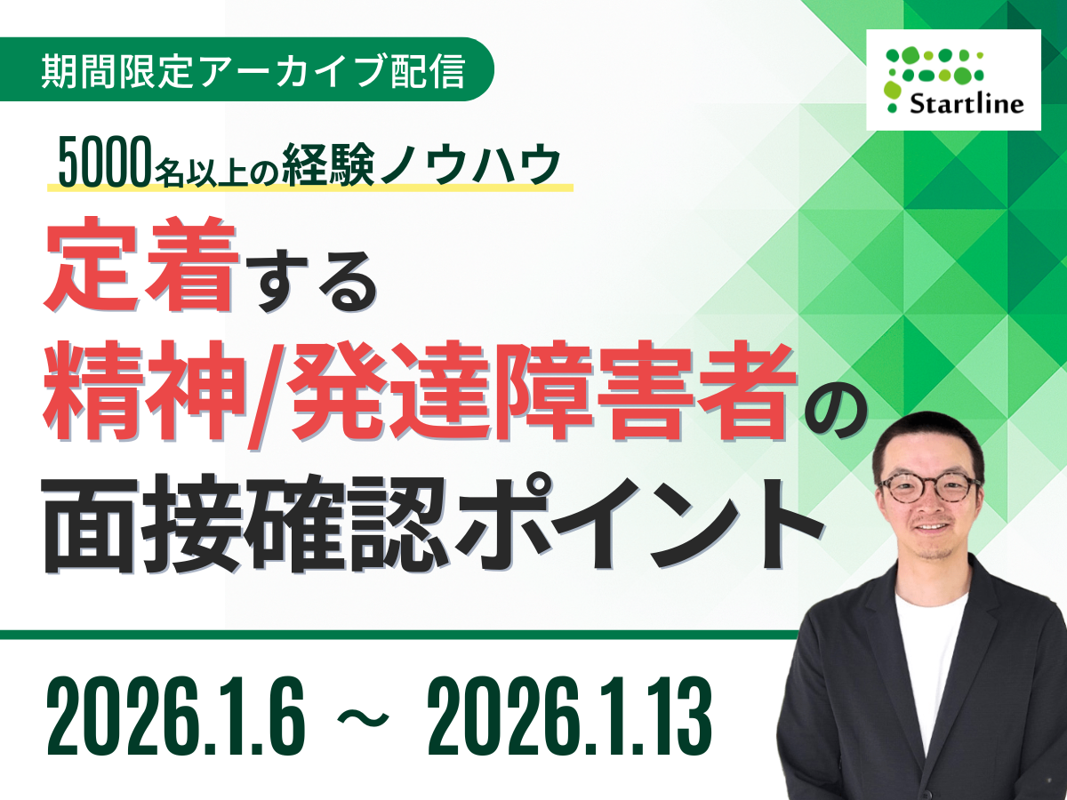 セミナー情報 カテゴリーから探すカテゴリーすべてカテゴリーライブ配信カテゴリーオンデマンドカテゴリーリアル開催カテゴリー障害者・支援機関向け オンデマンド オンデマンド2026/01/06 10:00〜2026/01/13 18:00 【1/6~1/13 限定配信】『5000名以上の経験ノウハウ』定着する精神/発達… オンデマンド2025/12/16 10:00〜2025/12/23 18:00 ※開催終了※ 『課題第1位の解決策』 障害者雇用の「業務」どうする? オンデマンド2025/11/17 10:00〜2025/12/17 18:00 ※開催終了※障害者雇用の[最新状況]と[失敗例]と[解決法]~最重要イロハ全部盛… 全部見る ライブ配信 これからのセミナー ライブ配信 2026/01/13 11:00〜11:40 【1/13(火)11:00~】 『2.7%対策の第一歩』 障害者雇用の[最新状況… ライブ配信 2026/01/20 11:00〜12:00 【1/20(火)11:00~】社内理解と協力体制をつくる障害者雇用研修とは?~経… ライブ配信 2026/01/22 11:00〜11:40 【1/22(木)11:00~】『サービス紹介』障害者雇用支援サービスサポート付き… これまでのセミナー ライブ配信 2025/12/11 12:00〜13:00 ※開催終了※点から線へ~事例で学ぶ 医療×福祉×企業がつなぐ連携支援の未来~【N… ライブ配信 2025/12/09 11:00〜12:00 ※開催終了※ 障害者雇用×関連法令 ~知らないうちに法令違反?~ ライブ配信 2025/11/25 11:00〜11:40 ※開催終了※『課題第3位の解決策』 障害者雇用の採用どうする?~定着する障害者の… リアル開催 2025/11/06 16:00〜17:00 ※開催終了※『三菱地所プロパティマネジメント株式会社ご登壇!』サテライトオフィス… ライブ配信 2025/11/04 11:00〜11:40 ※開催終了※障害者雇用の[最新状況]と[失敗例]と[解決法]~最重要イロハ全部盛… ライブ配信 2025/10/30 12:00〜13:00 ※開催終了※『2025年最新版・事前質問あり』発達障害やグレーゾーン社員の対応方… 全部見る リアル開催 これまでのセミナー リアル開催 2025/11/06 16:00〜17:00 ※開催終了※『三菱地所プロパティマネジメント株式会社ご登壇!』サテライトオフィス… リアル開催 2025/07/09 00:00〜00:00 ※開催中止※他社とつながる!対面&少人数で障害者雇用の情報交換の場【対面セミナー… リアル開催 2025/06/17 15:00〜17:00 ※開催終了※他社とつながる!『今こそ対面&少人数!』障害者雇用の課題解決と情報交… リアル開催 2023/06/07 17:00〜18:15 ※満席となりました※【6/7(水)17:00~】【講義+ワークショップ】ケースで… 全部見る 障害者・支援機関向け これまでのセミナー 障害者・支援機関向け 2025/09/17 13:00〜16:00 ※開催終了※【9/17(水)13:00~16:00】牛久に誕生!誰もが活躍できる… 障害者・支援機関向け 2025/07/08 16:30〜2025/07/10 17:00 ※開催終了※就労継続支援A型B型 支援員向け!企業が見ているポイント大公開~選考… 障害者・支援機関向け 2025/02/27 11:00〜11:40 ※開催終了※求人数/就職者は過去最多ペース!障害者雇用の最新状況と就職ポイント講… 全部見る