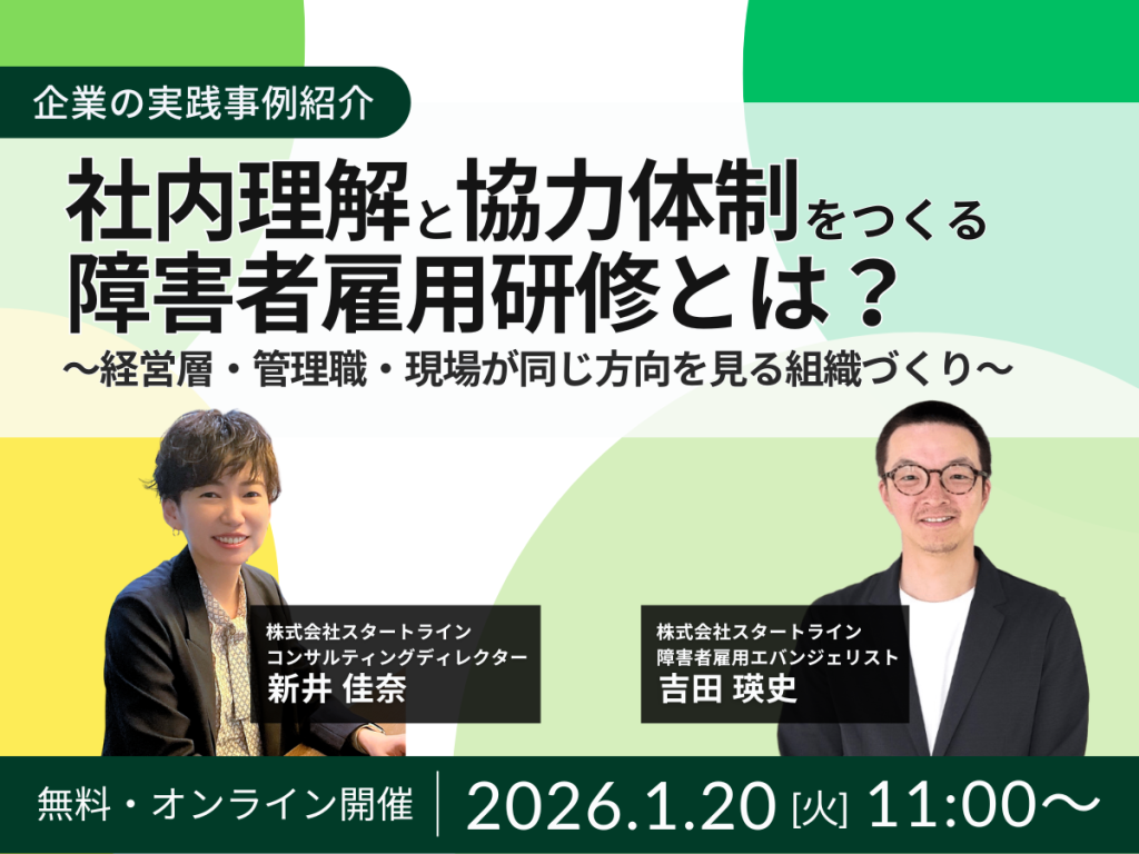 特別支援学校の教員として約10年勤務したのち、2019年にスタートライン入社。入社後の現場経験を経て、現在はコンサルティングディレクターとして、管理職向けの研修や、職域開拓、面談などの対応を行っている。